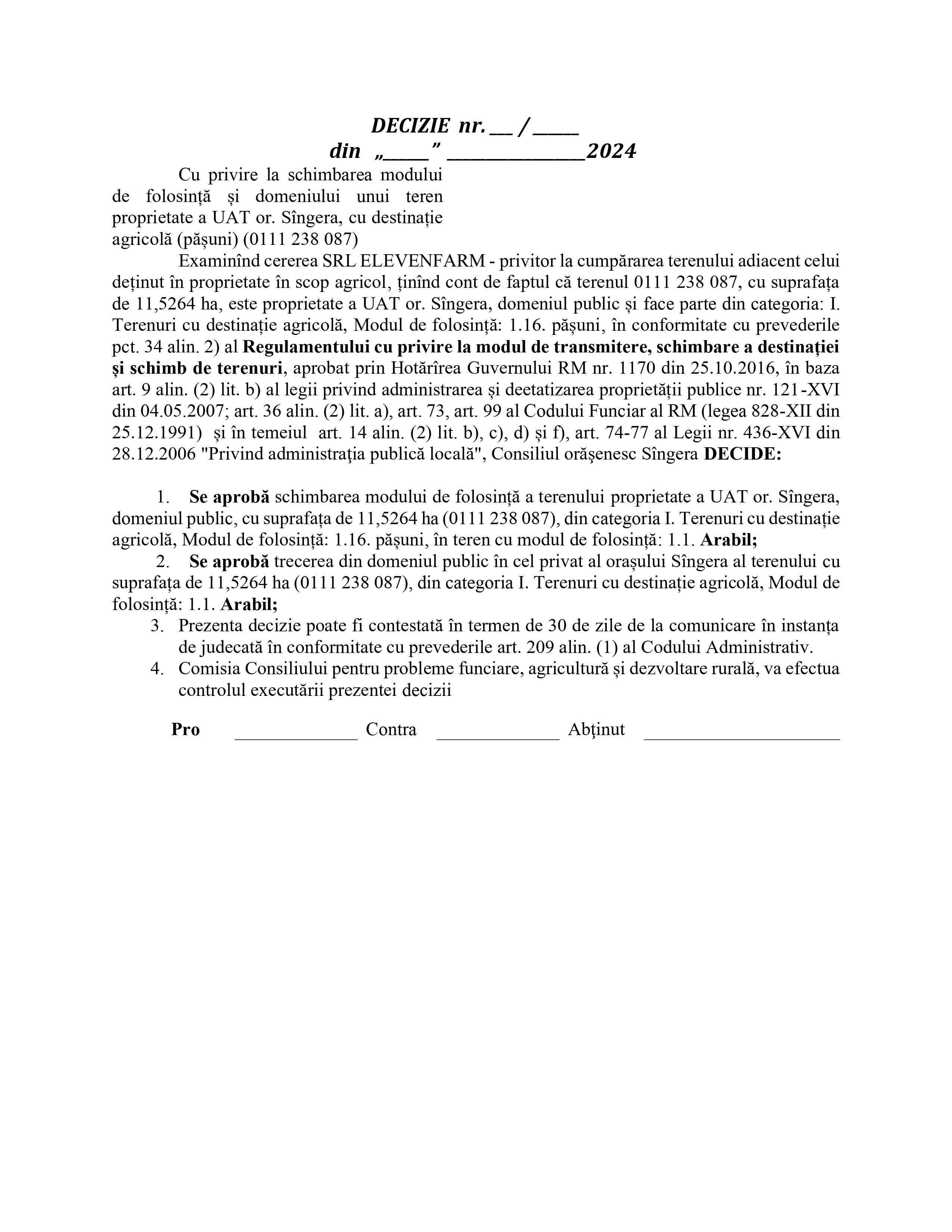 Consultări publice! Cu privire la schimbarea modului de folosință și domeniului unui teren proprietate a UAT or. Sîngera, cu destinație agricolă (pășuni) (0111 238 087).