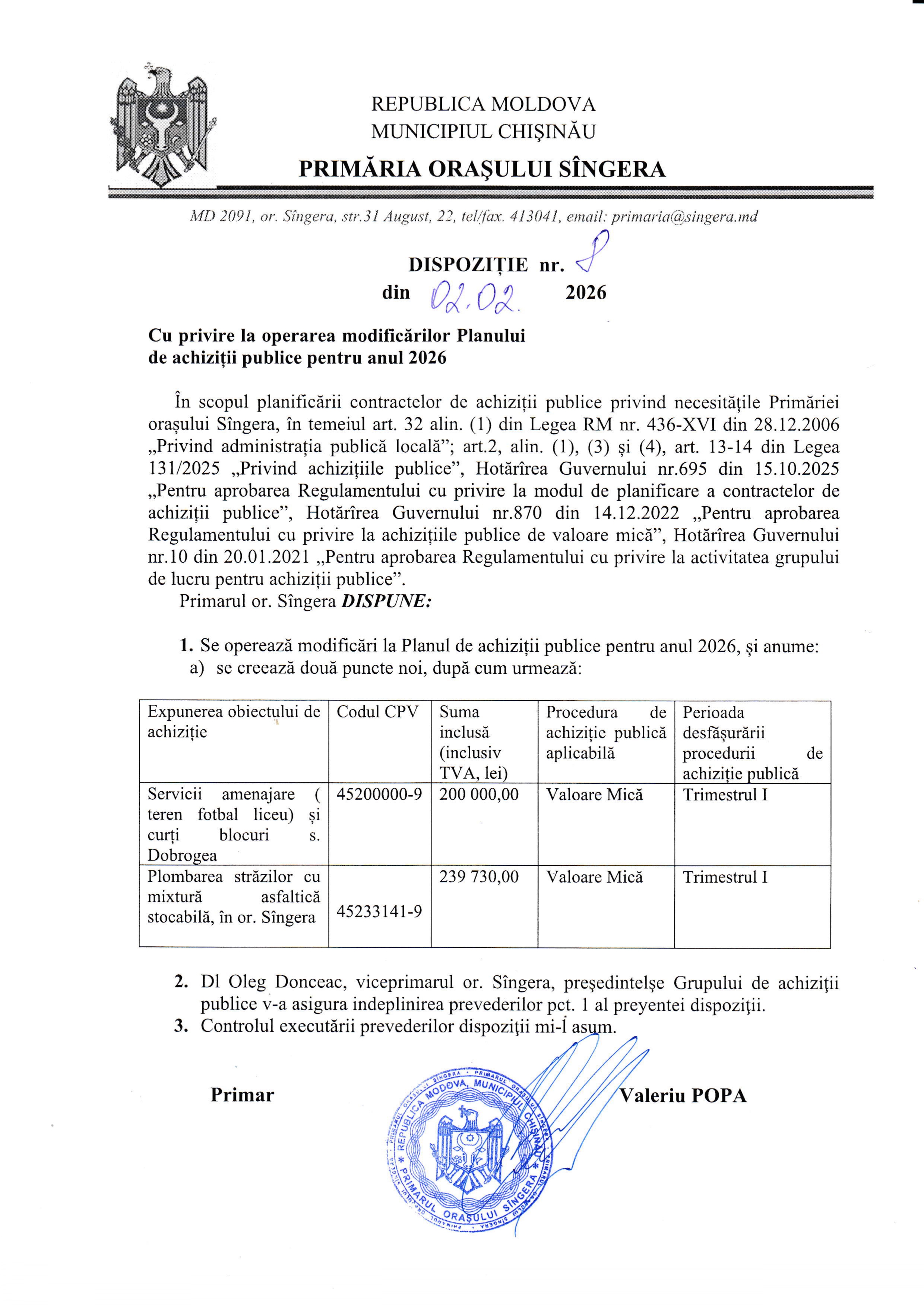 Cu privire la operarea modificărilor Planului de achiziții publice pentru anul 2026