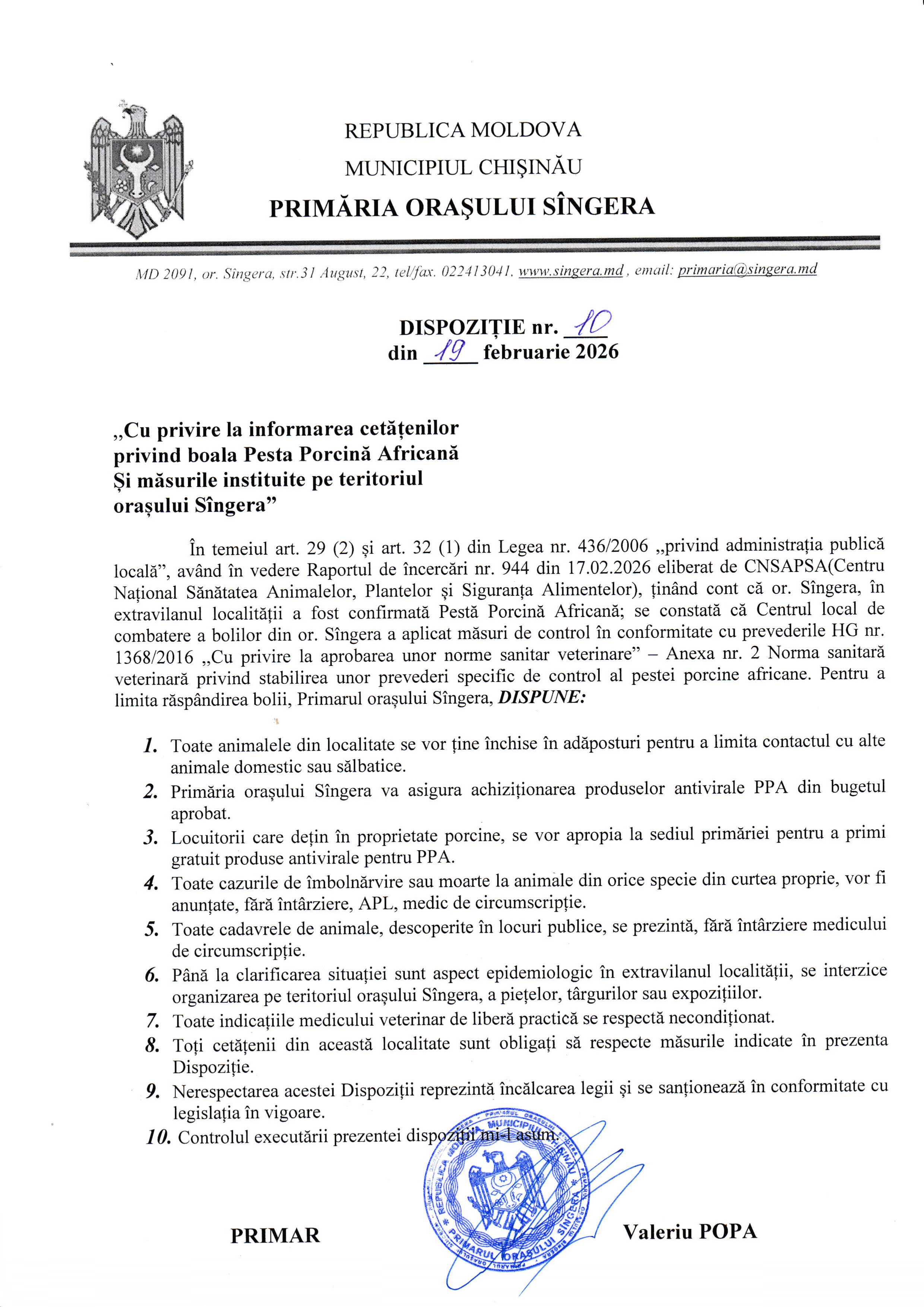 Primăria orașului Sîngera informează despre depistarea pe teritoriul orașului a unui focar de pestă porcină africană.Astfel, urmare a demersului Agenției Naționale pentru Siguranța Alimentelor nr. 33-06-C/284 din 17.02.2026, în conformitate cu raportul de încercări nr. 944 din 17.02.2026, a fost organizată ședința Comisiei Situații Excepționale a orașului Sîngera, care a stabilit: