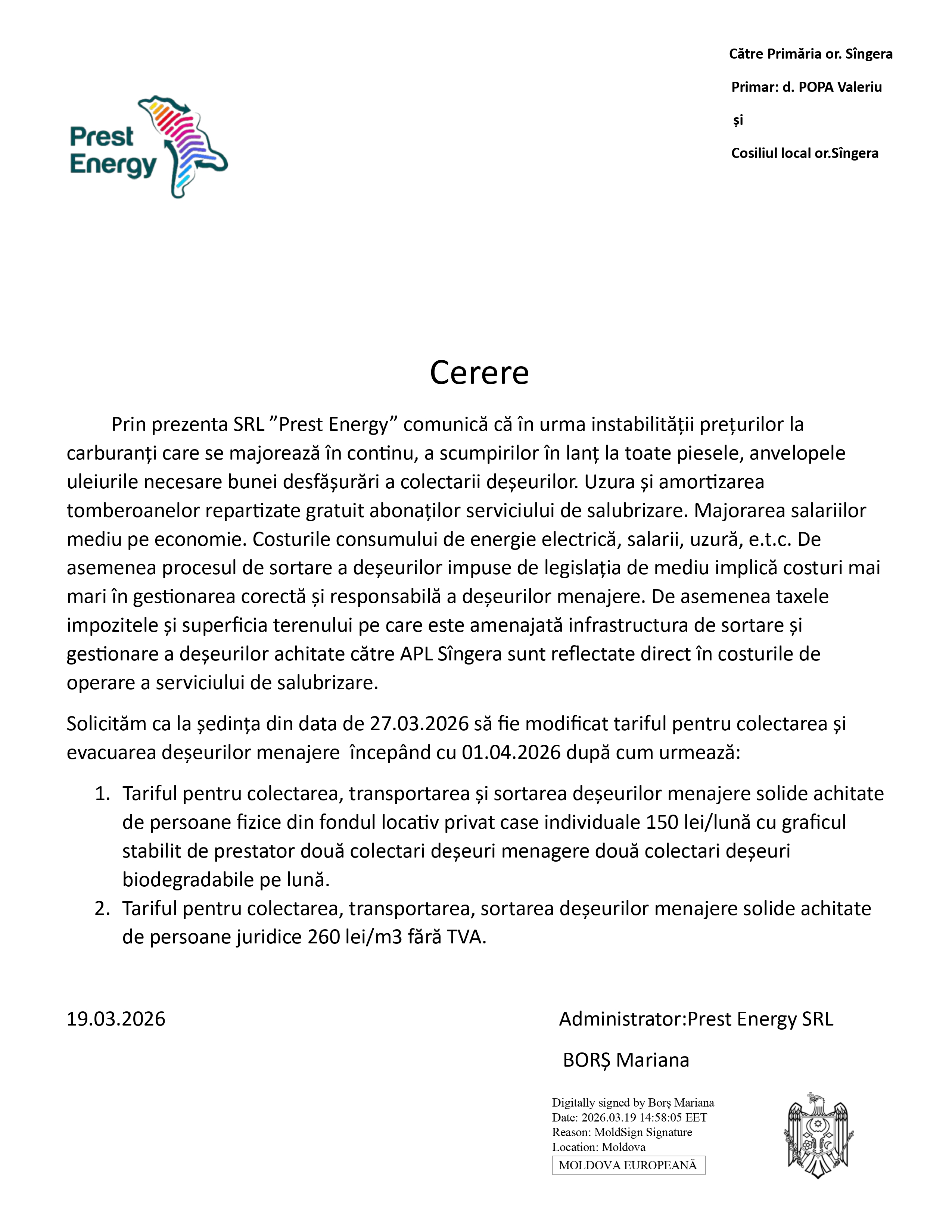 În conformitate cu prevederile art. 14 alin. (2) lit. z¹ din Legea nr. 436/2006 privind administrația publică locală, se supune consultărilor publice cererea înaintată de operatorul SRL „Prest Energy”, care prestează servicii de salubrizare pe teritoriul localității.