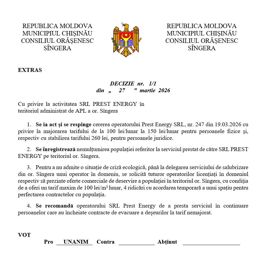 Referitor la serviciul de colectare a deșeurilor.Consiliul or. Sîngera a respins propunerea de majorare a tarifului de evacuare a deșeurilor.