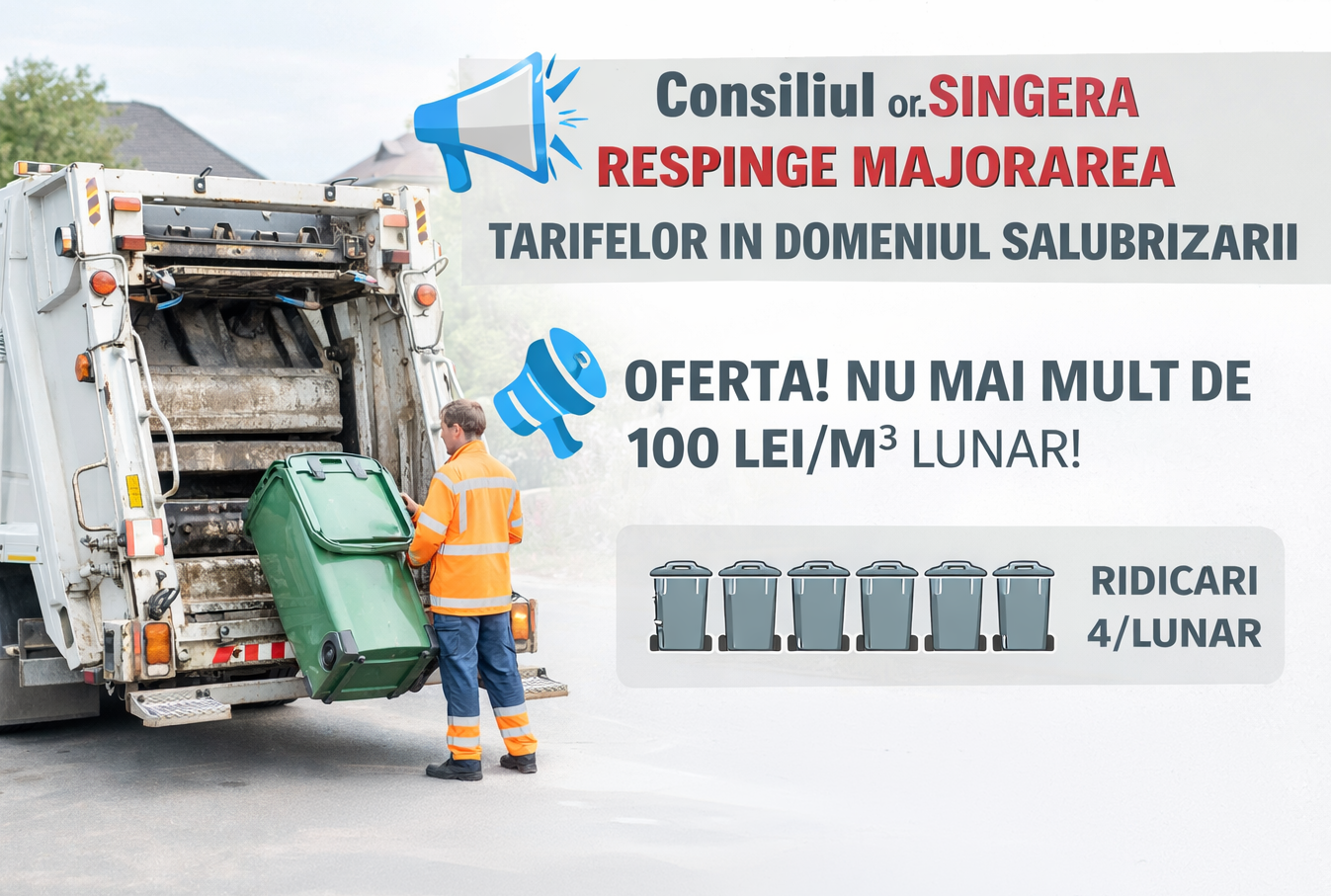 Pentru a nu admite o criză ecologică, Consiliul or. Sîngera invită toți operatorii în domeniu să prezinte oferte comerciale de deservire a populației în teritoriul or. Sîngera, cu condiția de a oferi un tarif maxim de 100 lei/m3 lunar, 4 ridicări.