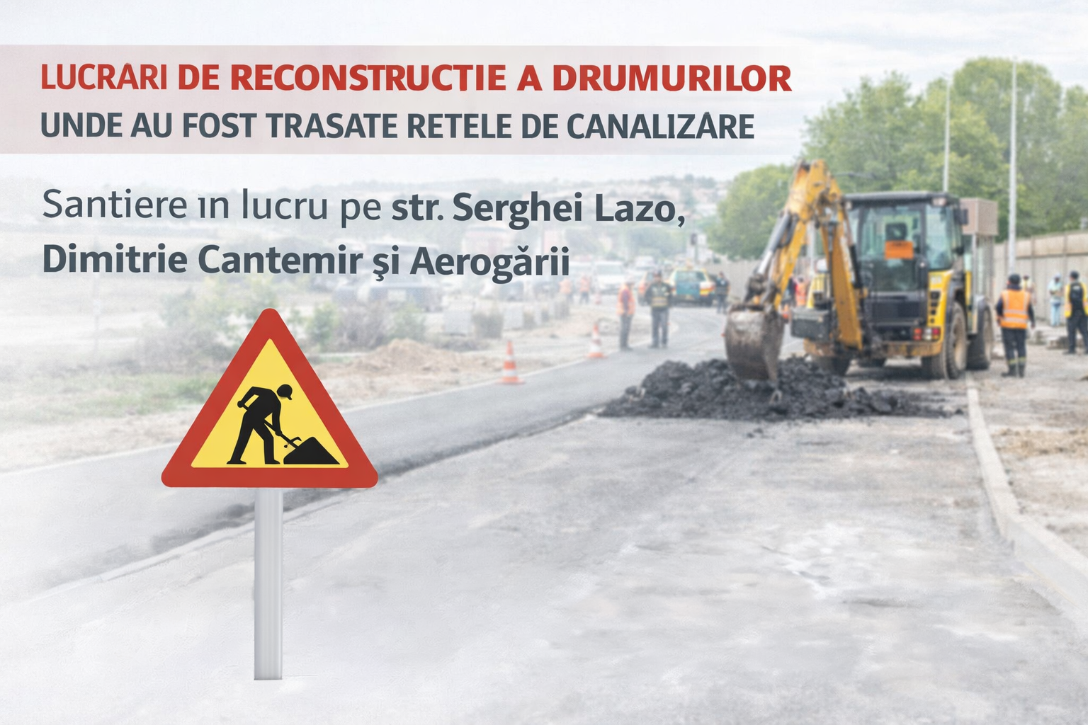 Continuăm lucrările de reconstrucție a drumurilor unde au fost trasate rețelele de canalizare. Astfel, Din data de 2 aprilie, încep lucrările de reparație a străzilor Serghei Lazo, Dimitrie Cantemir și Aerogării. Pe perioada reparației drumurile vor fi închise pentru circulație, periodic și pe segmente.