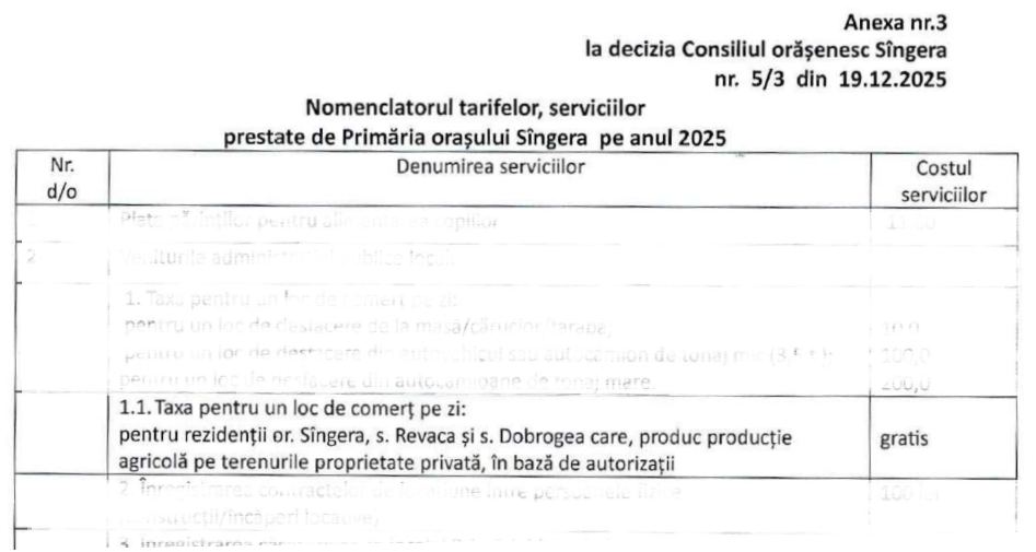 Pentru susținerea producătorilor agricoli din orașul Sîngera (Dobrogea și Revaca), primăria orașului Sîngera a decis scutirea de orice taxă pentru vânzarea produselor crescute în propriile gospodării - decizie care va fi aplicată și în următorii ani!