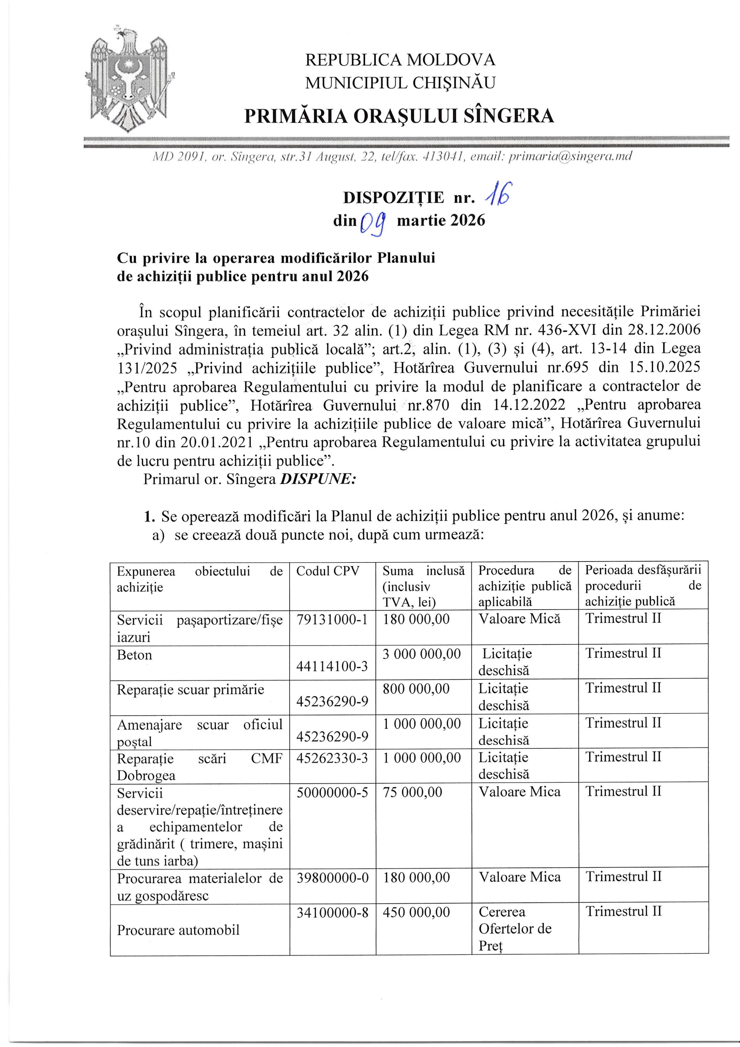 Planul anual pentru achiziții publice provizoriu pentru anul 2026